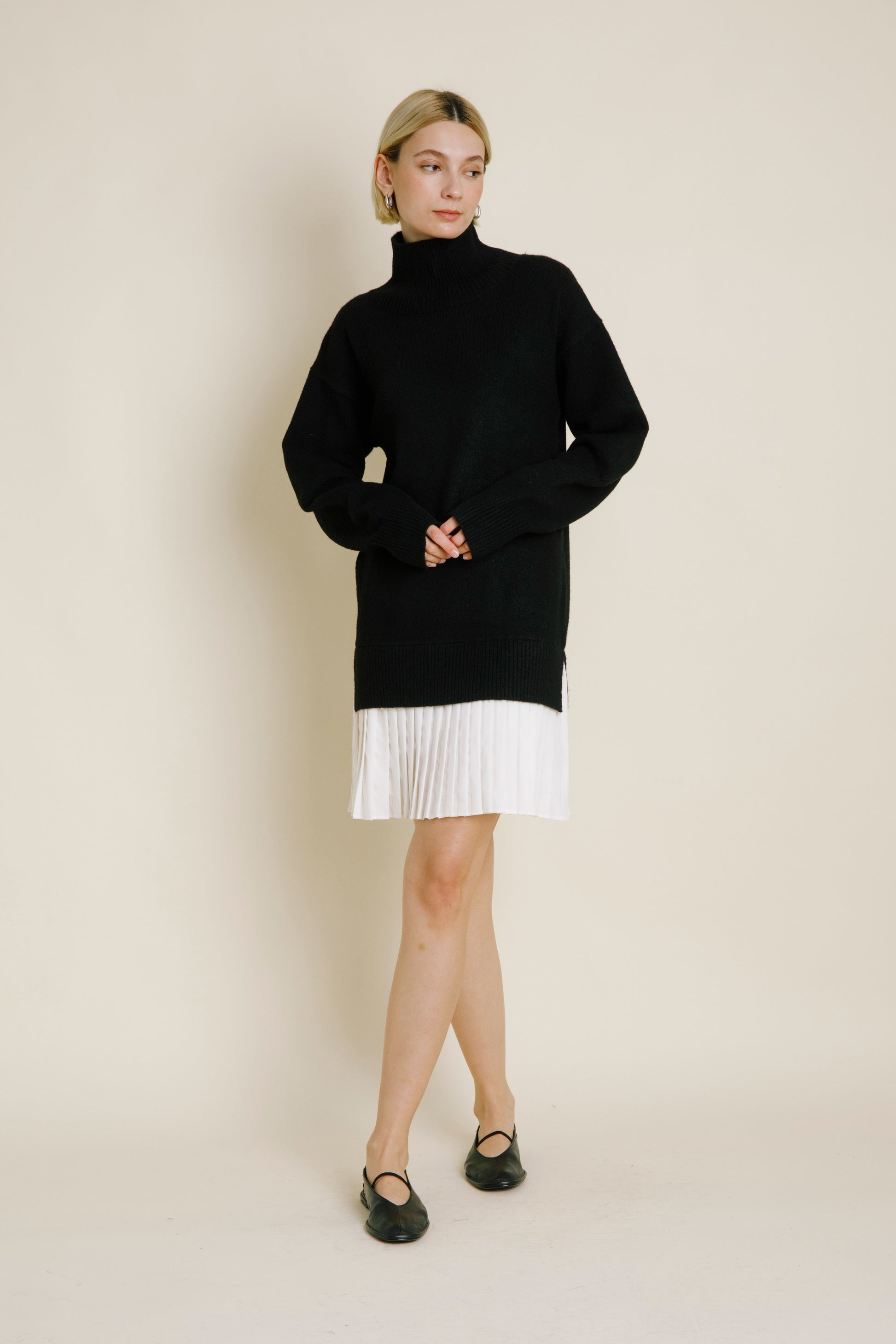 The Black Taylor Turtleneck Sweater Dress is the perfect blend of cozy and chic. With its dropped shoulders and pleated skirt, it's sure to make a statement whether you wear it with boots or heels. The long sleeves and relaxed fit make it a comfortable and versatile option for day to night wear. Stay warm and stylish in this dressy yet relaxed sweater dress.