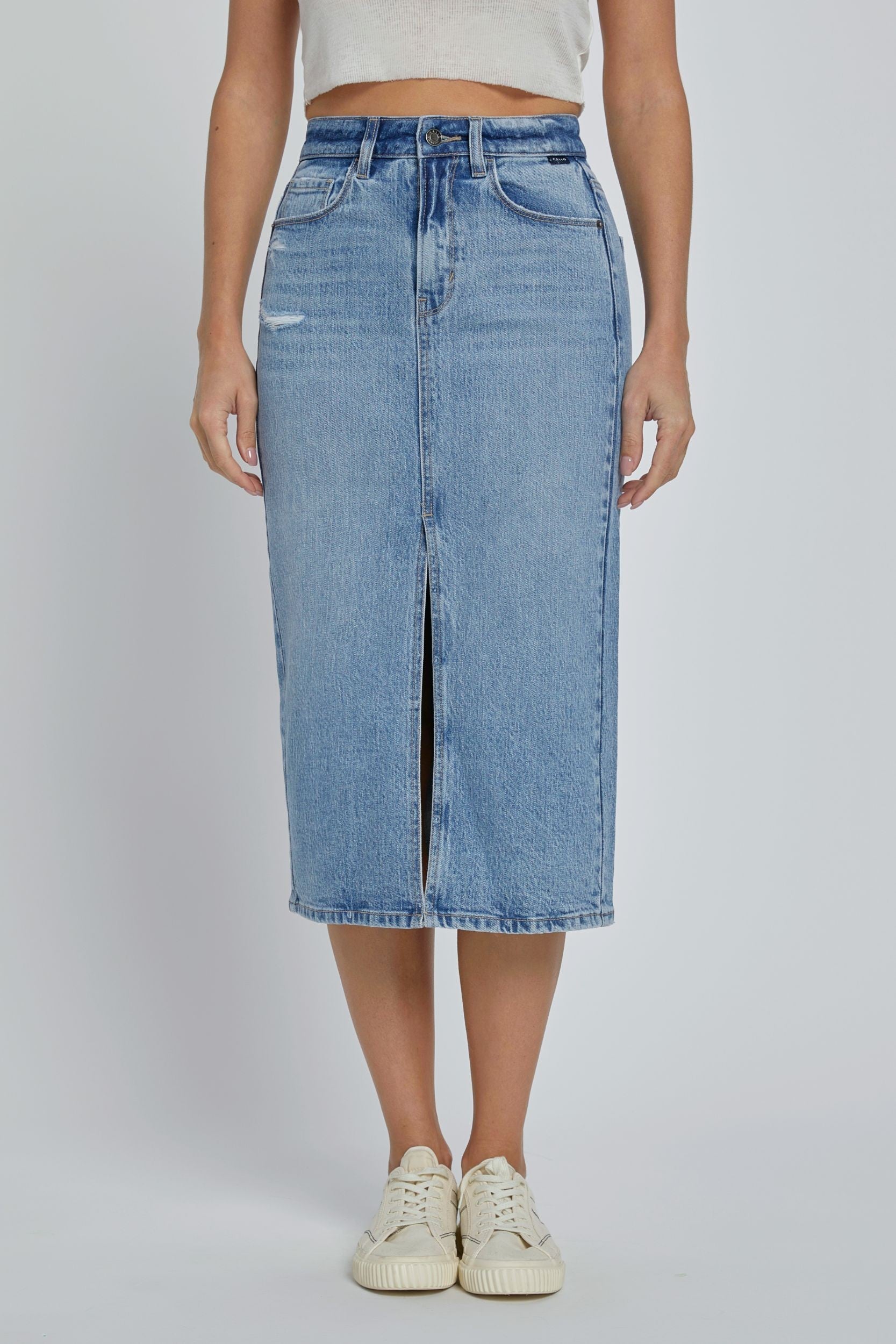 Elevate your wardrobe with our Lola High Rise Medium Denim Skirt with Slit. It's both comfortable and versatile. Perfect for dressing up or down, this statement piece is below the knee length and will be your go-to for any occasion.