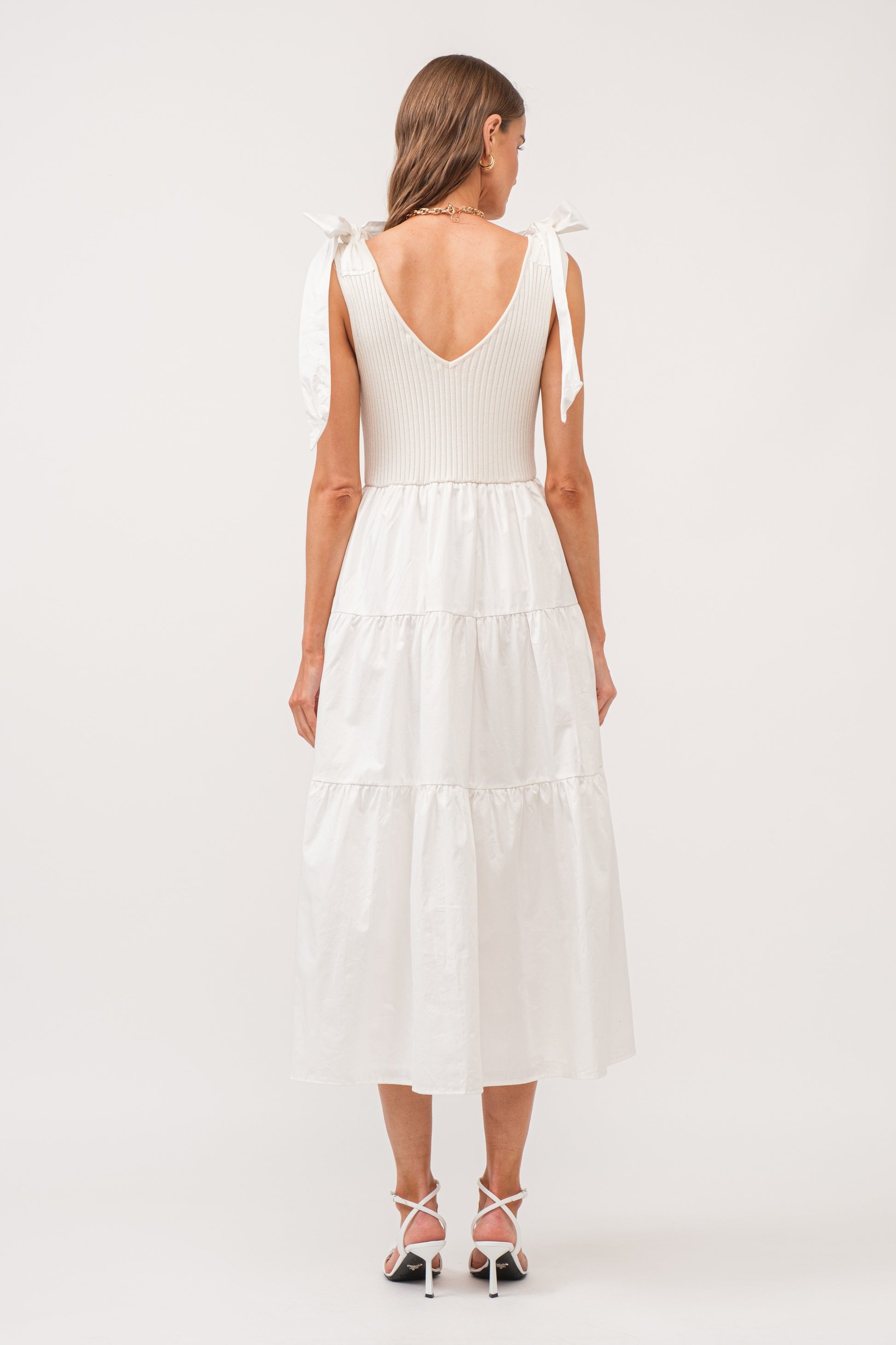 This flirty Off White Shelby Dress, features a sleeveless design and a full tiered skirt. A playful bow tie at the shoulder adds a touch of fun to this midi dress, while the knitted top ensures a comfortable and relaxed fit.