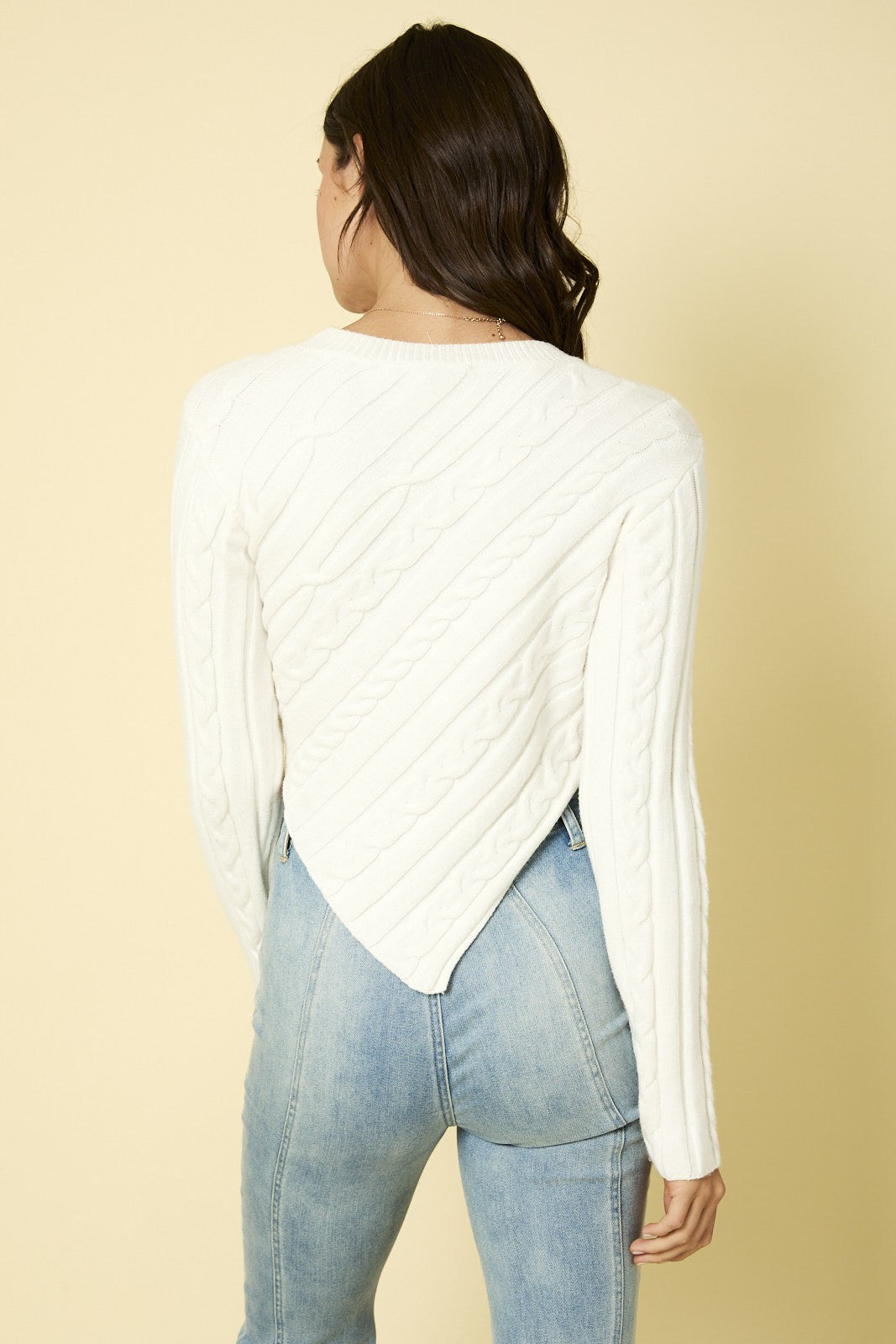 Get ready to cozy up in style with our White Valeria Crew Neck Cable Sweater. This cable knit sweater boasts a warm and comfortable fit, perfect for those chilly days. Its long sleeves and asymmetric design make for a versatile and effortlessly chic look. Wear it casually or dress it up, either way you'll be comfortable.